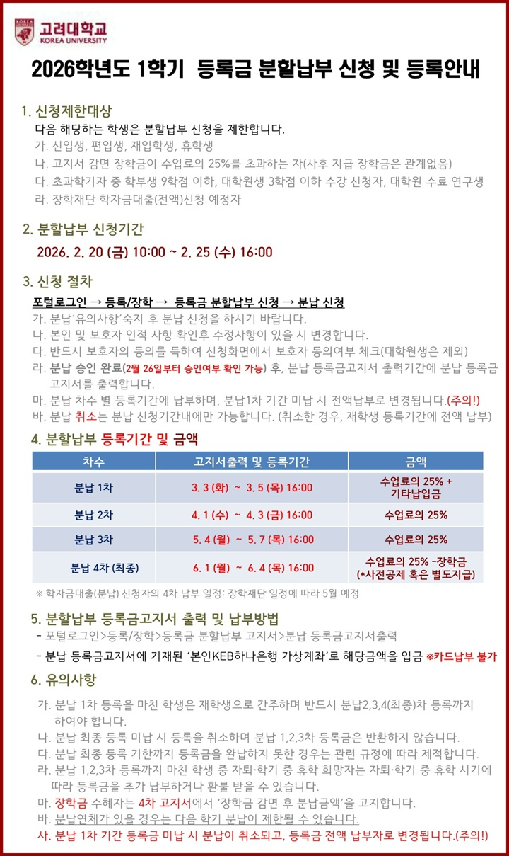 [공통] 2026년 1학기 대학(원) 등록금 분할납부 신청 및 등록 안내